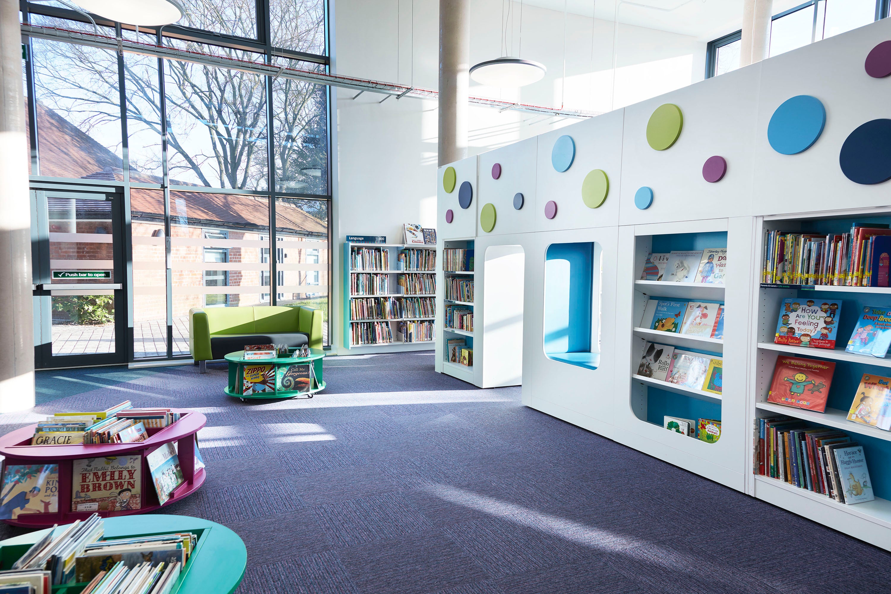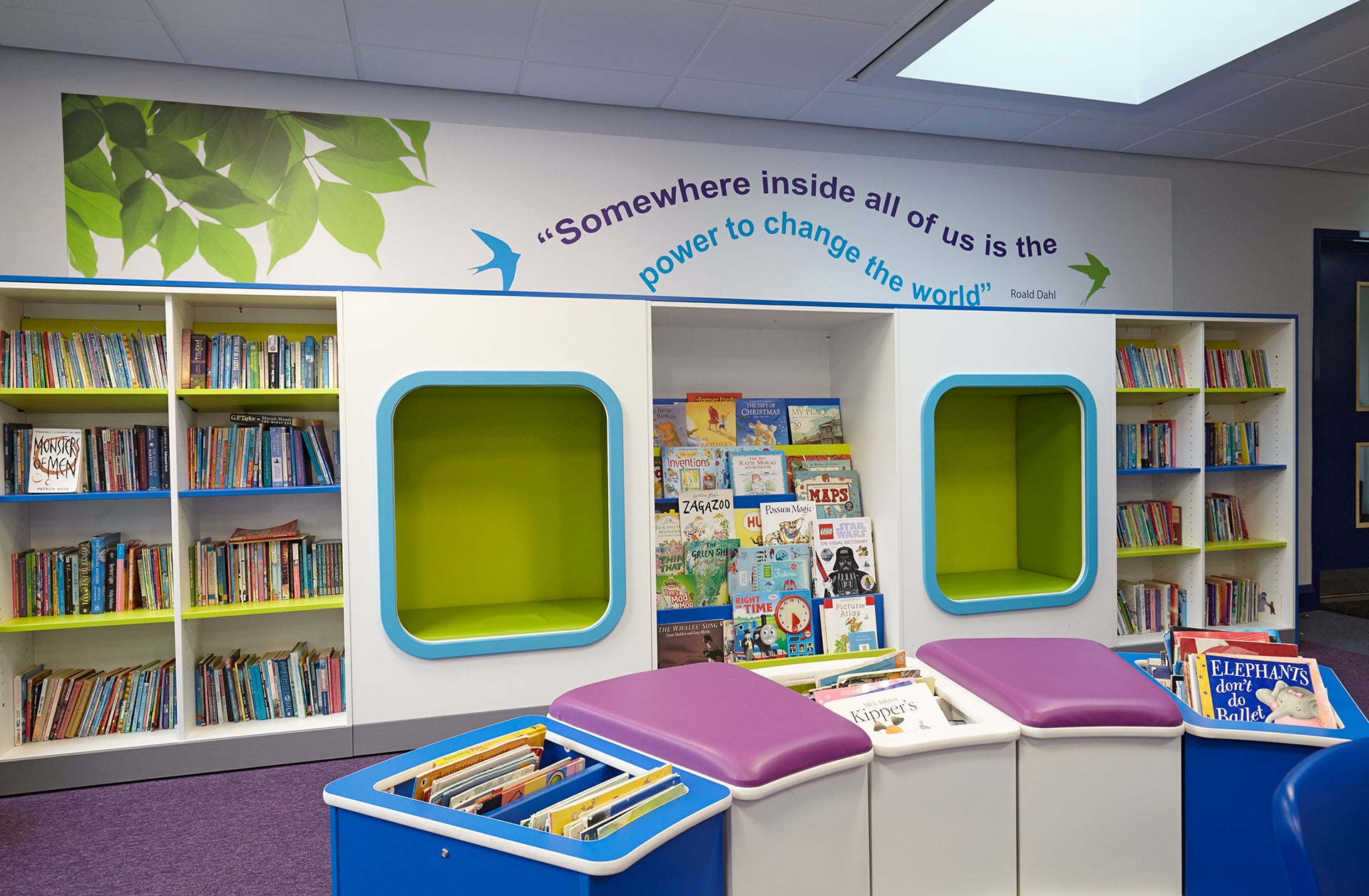 Barrington CoE Primary School Library - From the beginning, the design process was different with Morleys. They took the time to come into school, look at the space for our library and talk to us about what we were aiming to achieve.We had a group of children involved in the design process and Morleys met with them and listened to their ideas. The whole school was involved in selecting the quote to go on our library design, and the children see the library very much as their library. We are all delighted with the finished result – it is the loveliest room in our school!