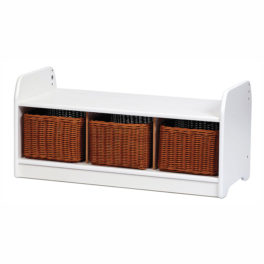 Low level storage unit in white is designed for easy access. Resources are accessible from both sides of unit. Coordinating items available.