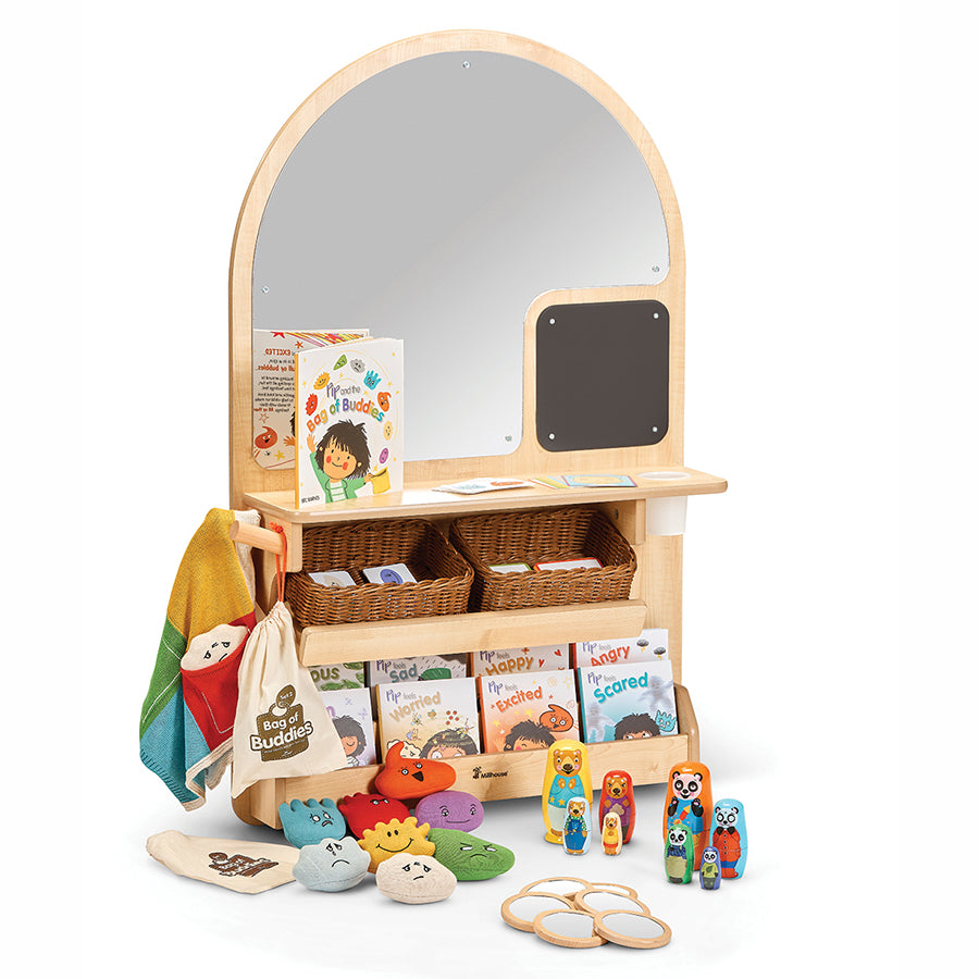 All Emotion Stations have a large integral mirror to reflect expressions, and a chalk board insert that can be used by practitioners and children, to support and extend learning. Each station features baskets and shelving to allow children to self-serve, and resources can be efficiently stored when not in use.