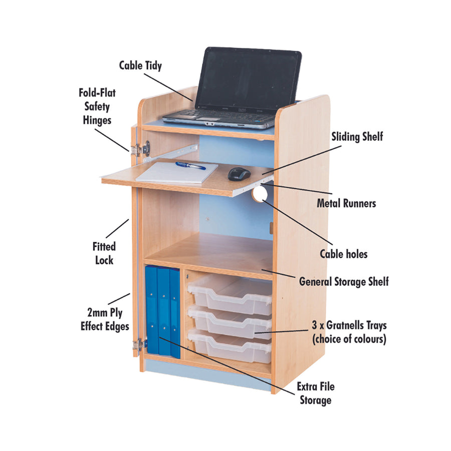 The KubbyClass® Laptop Tidy is manufactured in a solid MDF Maple laminate with 2mm ply effect edging. The units are supplied static with a plinth as standard, but can be manufactured to be mobile on castors if preferred.