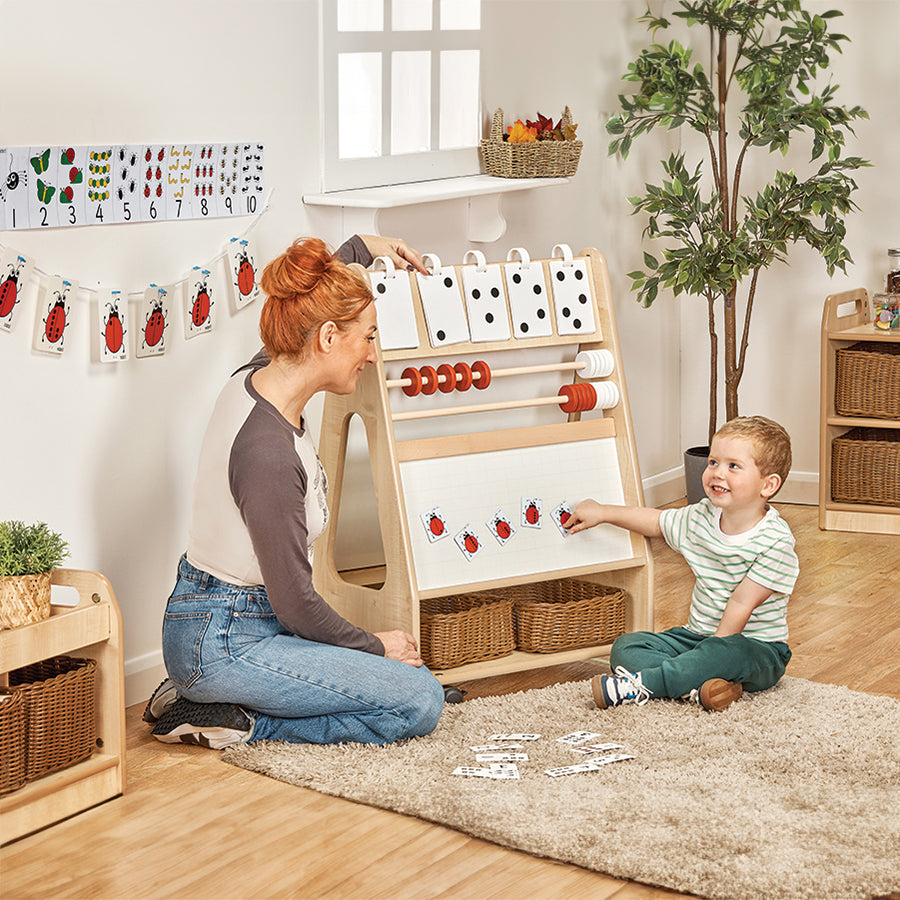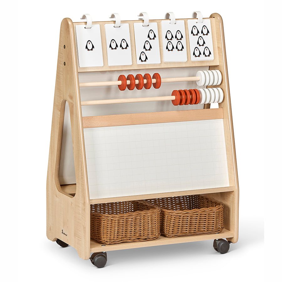 The Mobile Double-Sided Number Station is a versatile unit that features Rekenrek counting frames on one side, magnetic whiteboard surfaces on both sides, plus handy shelves and baskets for storage.