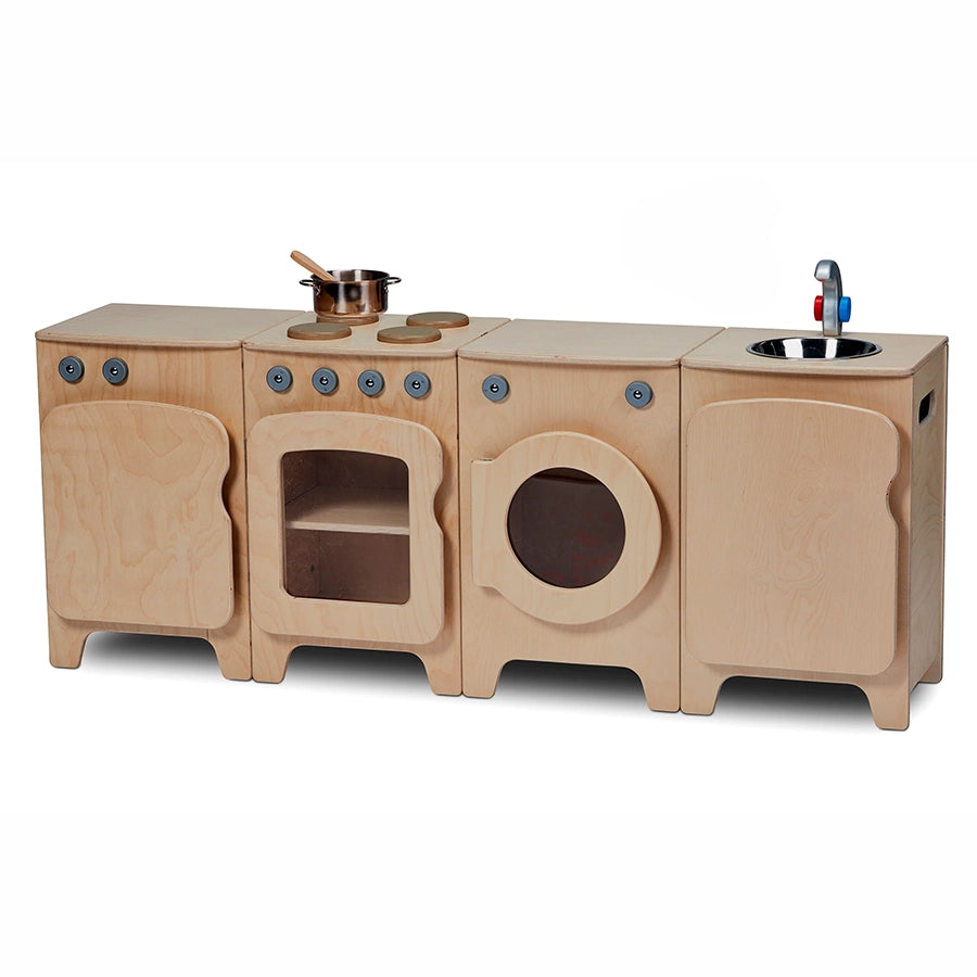 Delightful natural kitchen set specially designed for children aged 3 years+. The natural finish helps create a calming play environment whilst the robust design incorporates a number of features for safety and durability. Includes: Cooker, sink, washer and fridge.