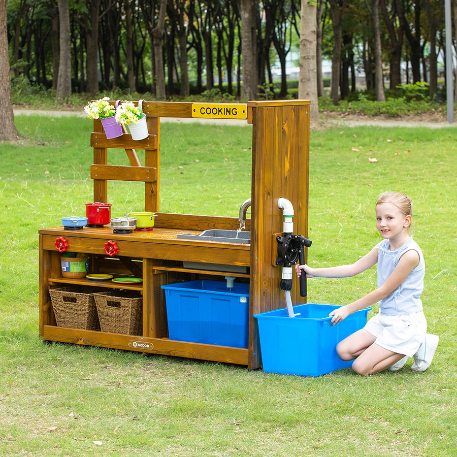 This kitchen unit is ideal for both role-play and water play. Features a plastic sink bowl and an anti-corrosion steel water pump which allows children to pump water into the sink – and then drain after use. Also includes toughened plastic hob rings - (hot (red)/cold (black). For double the fun this unit combines well with our Outdoor Snack Bar (sold separately). Supplied flat packed for simple self-assembly. Plastic sink bowl and 2 blue tubs are included.