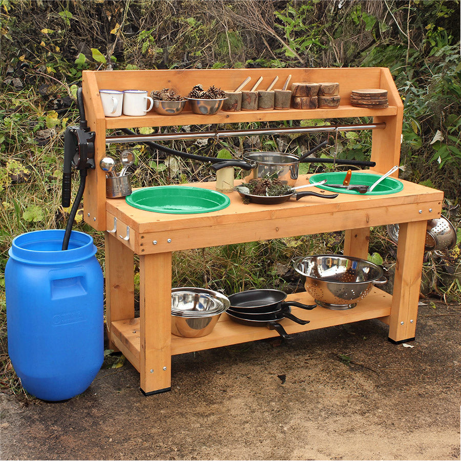 - Pump and Water Station: Includes a functional pump and upcycled barrel, allowing children to add water to their mud kitchen creations.