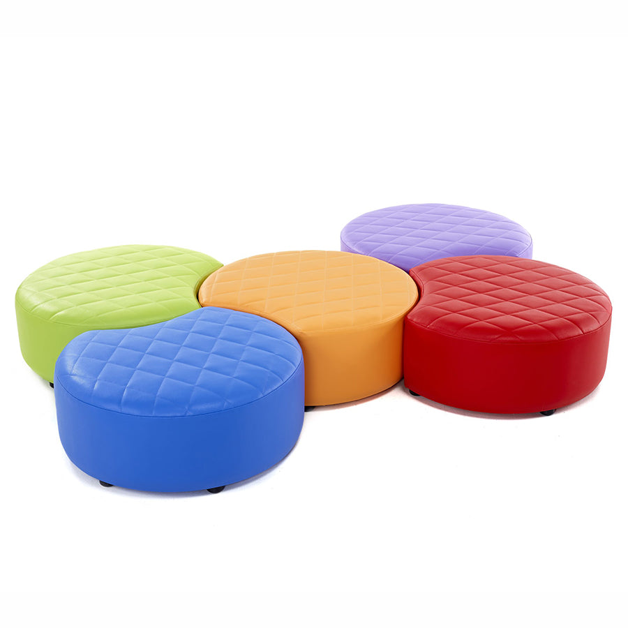 The Quilted Snuggle Seats are supplied as a set of 5 seat in bold primary colours. The seats are made with a quilted vinyl for extra comfort. Snuggle seats make a great set of breakout furniture, manufactured with a solid wood frame and fully upholstered these seats are made to last. With its circular cut out shape design you can create a variety of different seating arrangements to suit your space requirements quickly and easily.