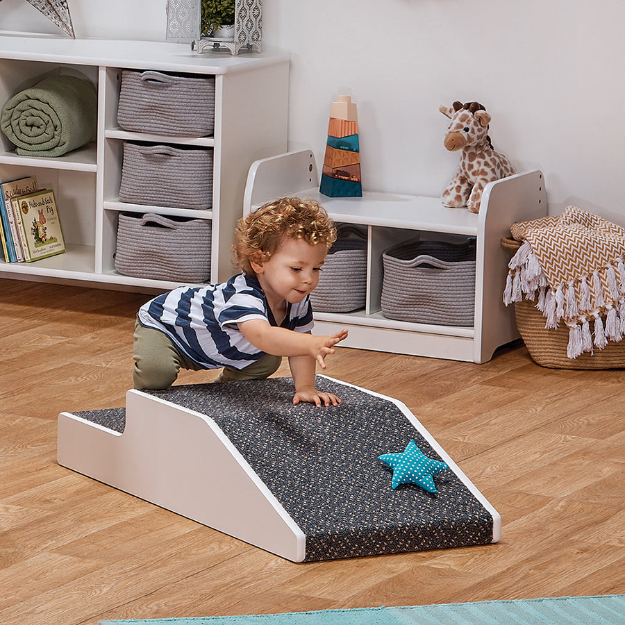 White Step N Crawl is specially designed for children aged 12 months+ to encourage discovery, strengthen coordination and support agility. The heavy-duty carpet provides a tactile surface for babies to crawl on.