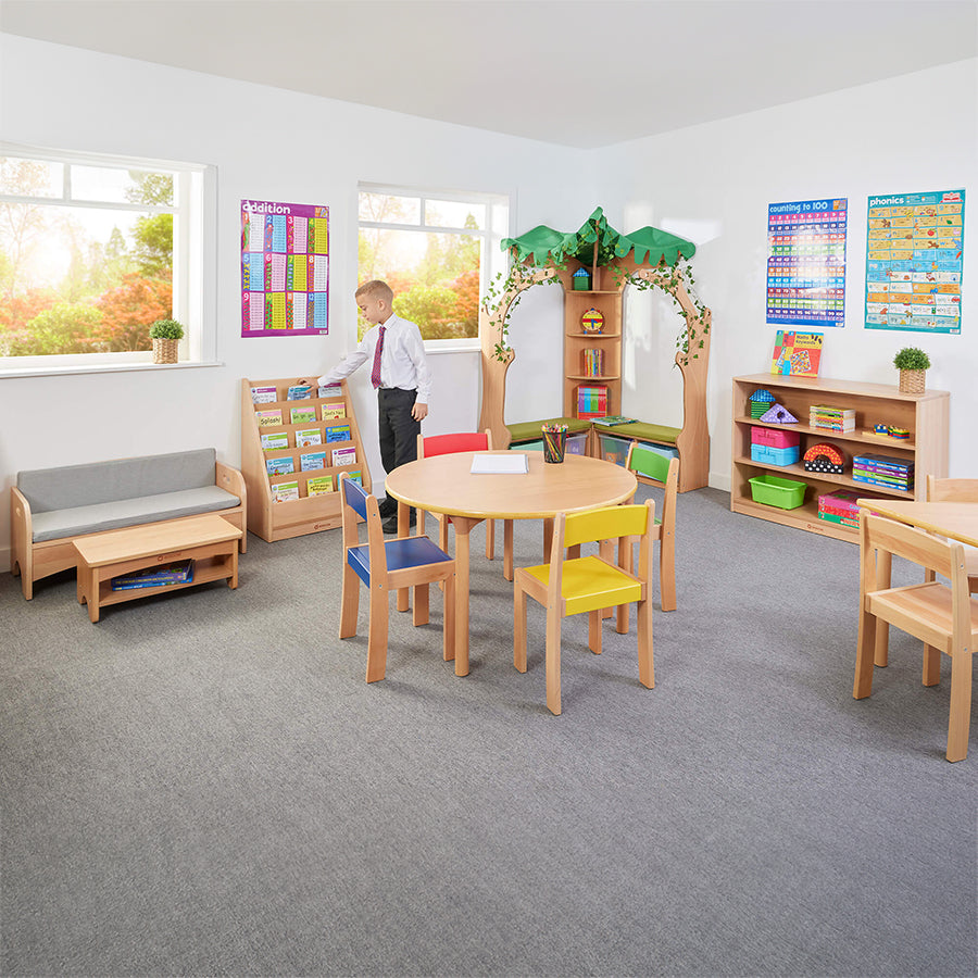 Our Beechwood range is a high-quality solid wood option for your complete classroom furniture requirements. Our established and popular Beechwood table and chairs range is now complemented with matching furniture designed to create functional spaces and zones to increase learning as well as enhance emotional and behaviour outcomes. For book storage we have a practical range of useful single and double book stands which are ideal for displaying your picture books. This display unit has 5 compartments for face on display of books. Supplied flat packed for simple self-assembly.