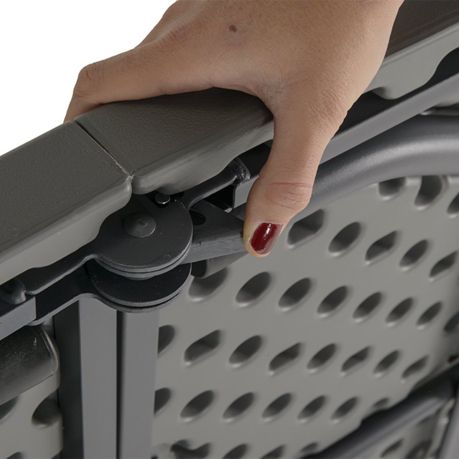 The Zown Fold In Half Rectangular Table is a lightweight folding table for professional use with proven reliability in the hotel and catering industry it's perfect for banquets and events. Table measuring 183 x 75 cm with a mid-folding top and a carrying handle, like a suitcase. The folding table top facilitates the table’s handling and storage.